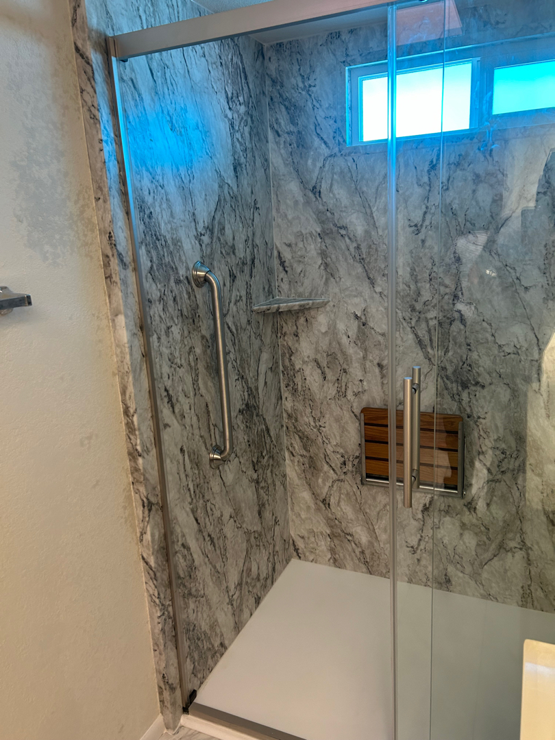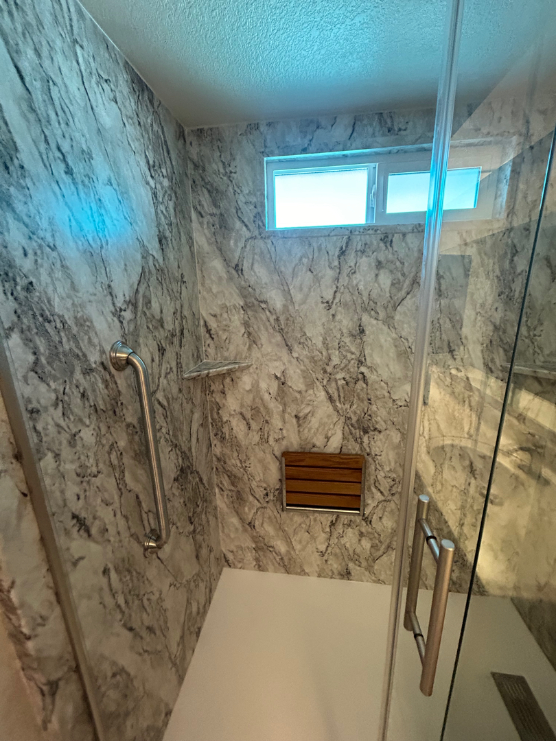 We start the renovation by prepping the walls with moisture-resistant greenboard and installing backing for grab bars. Next, we install a 36 x 60 composite stone acrylic barrier-free, slip-resistant shower pan. We also move the drain to fit the new setup. Finally, we add a 3-wall acrylic surround in Lightning color and seal all the joints, ensuring everything is durable and watertight.