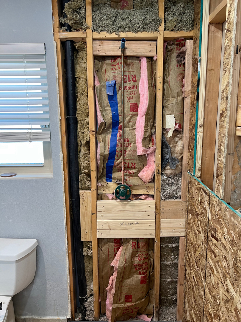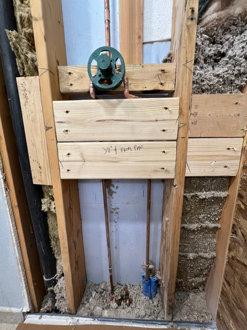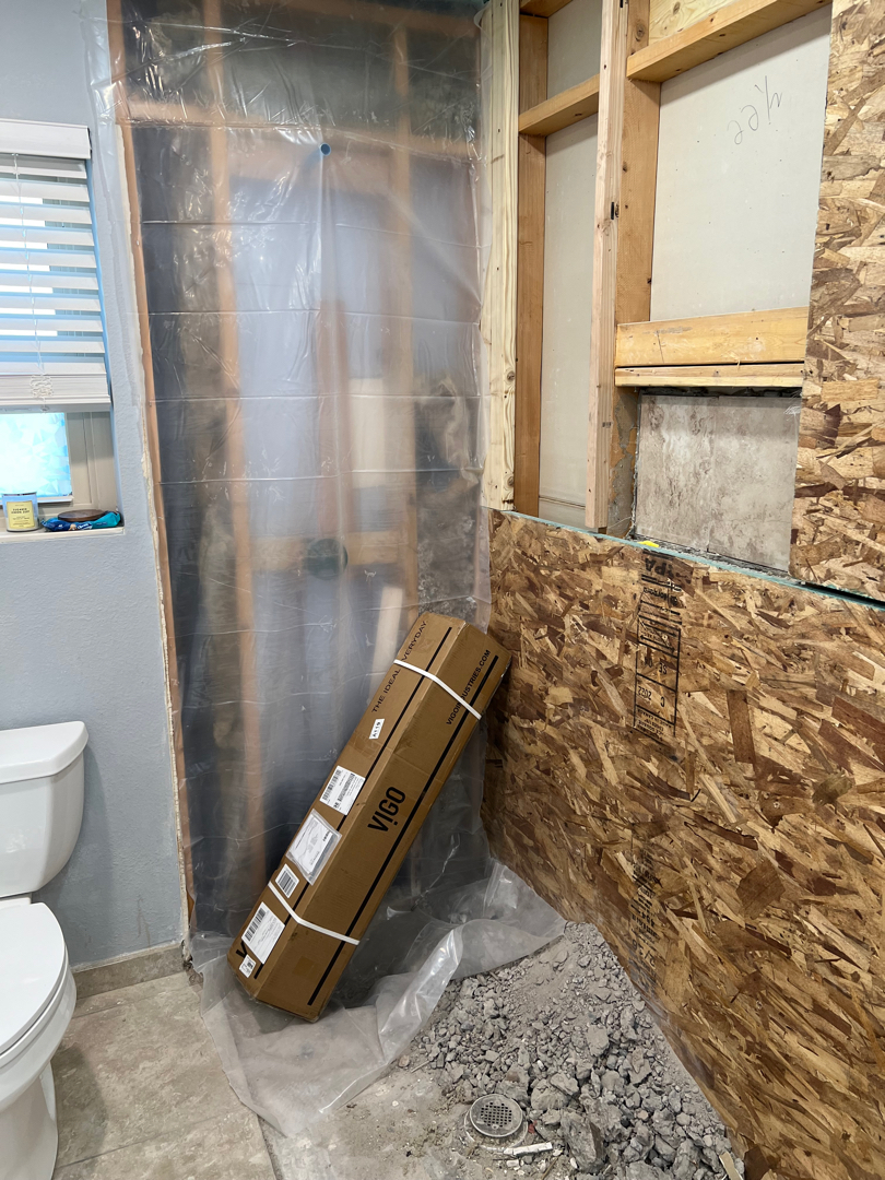 The first step? Demolition. Out came the old shower pan, tile surround, outdated valve, and even the right-side wall and door. Don’t worry — we kept things clean with our HEPA dust collection system to keep the home (and lungs) happy during the process.