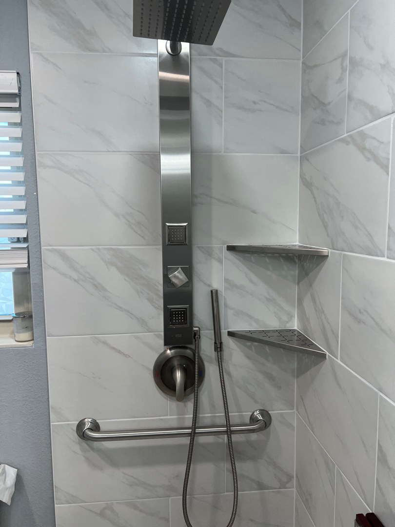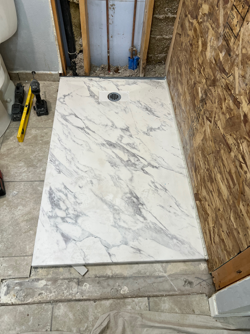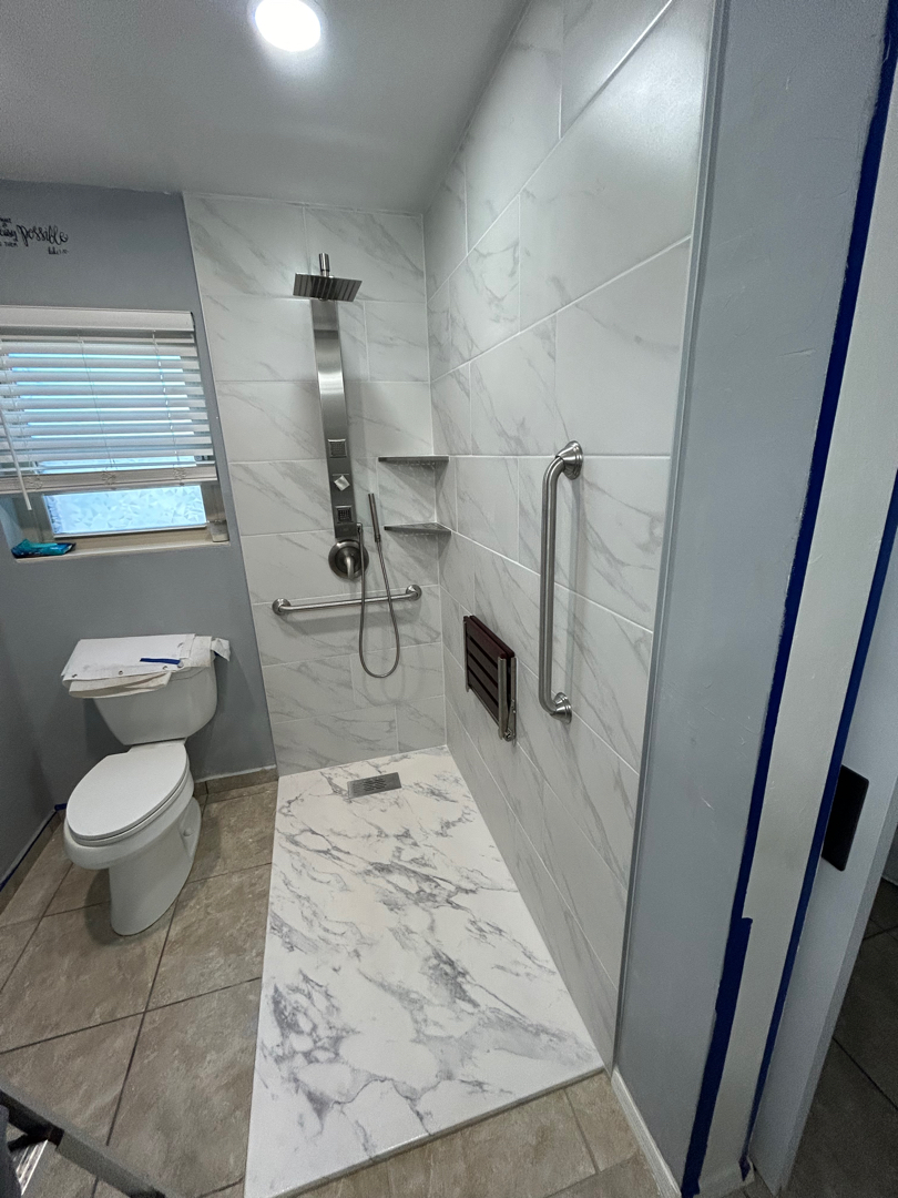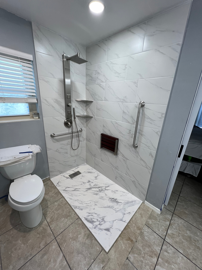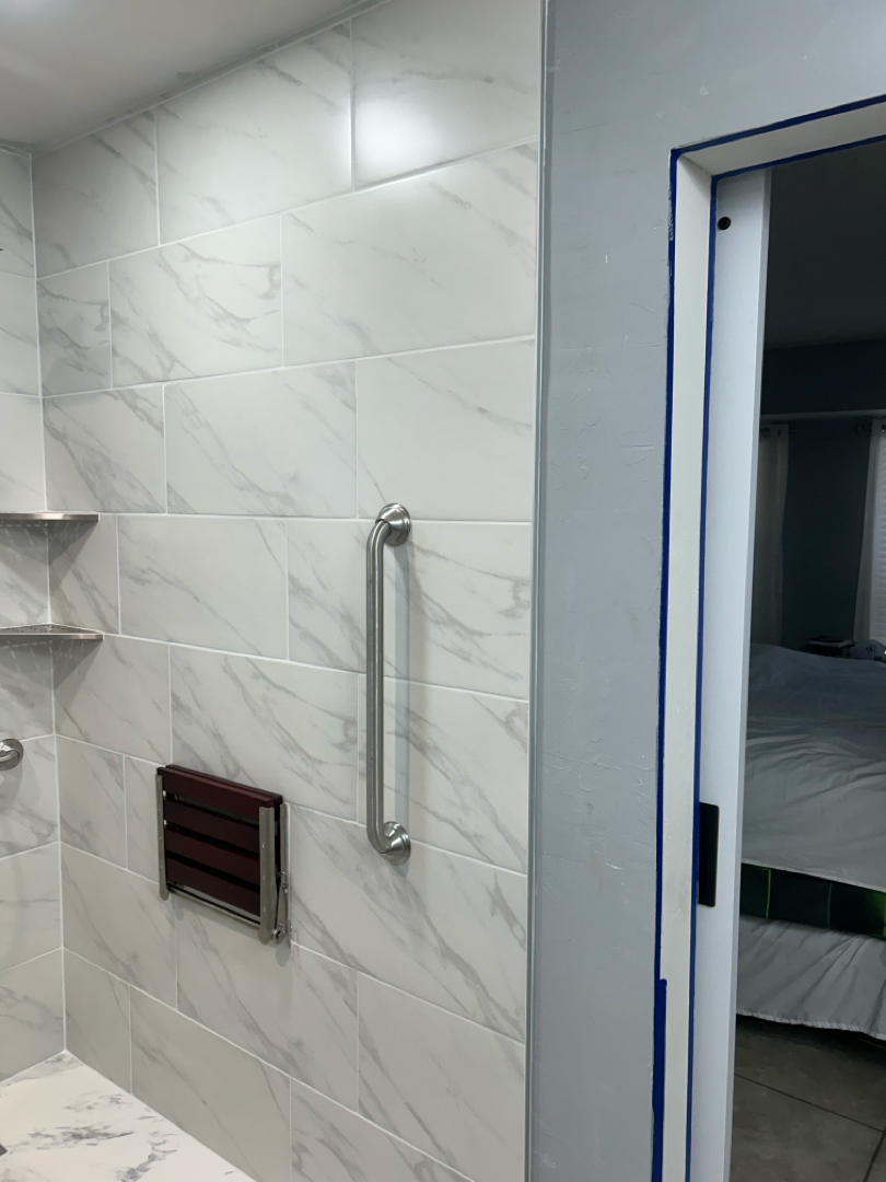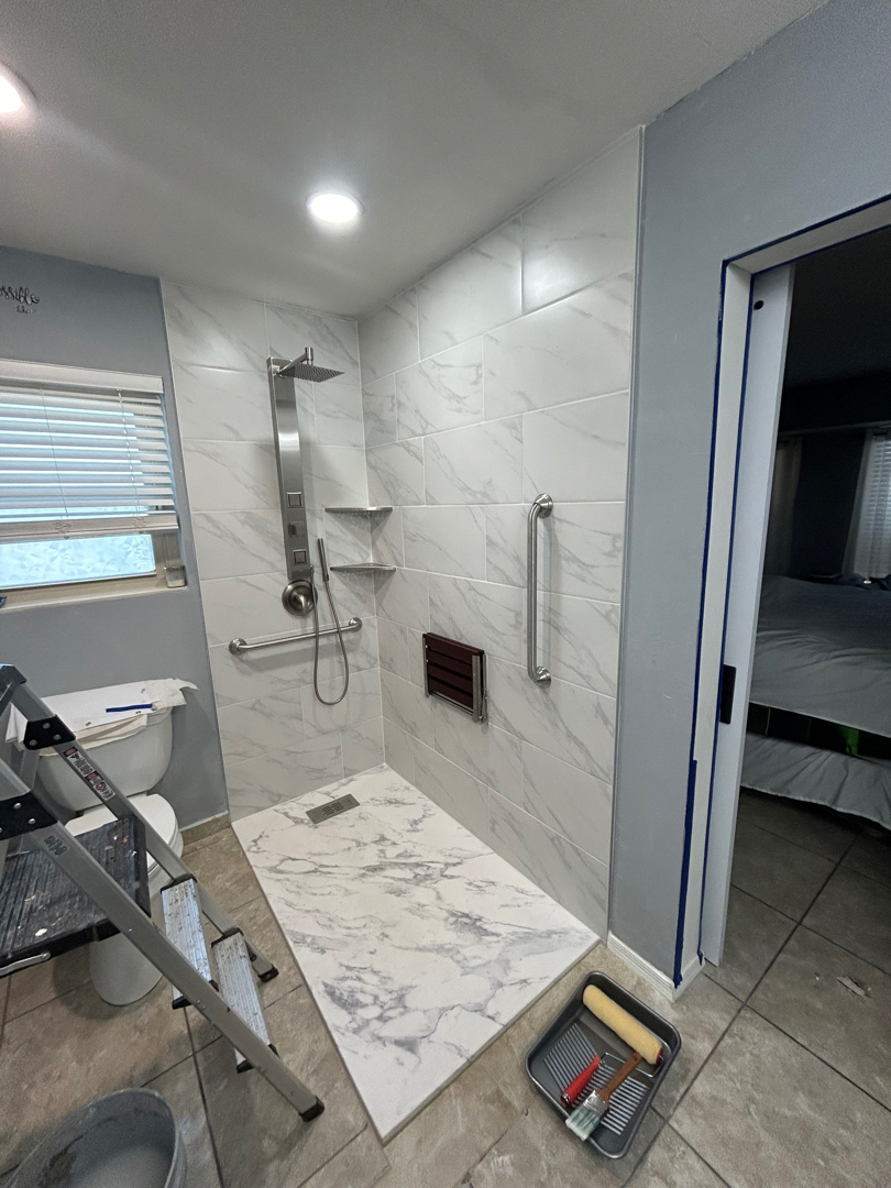 With the old space cleared out, we prepped for something much more modern and accessible. We installed a beautiful barrier-free white marbled shower pan with a center drain — easy to enter and elegant to look at. The walls were finished with stunning 12×24 marble-look tile, creating a serene and timeless vibe. Every joint was sealed with color-matched silicone for a polished, water-tight finish.