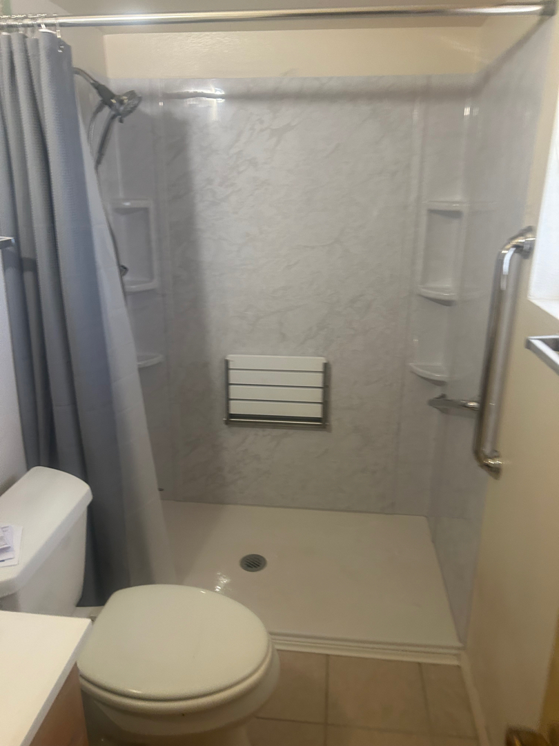 Walls were rebuilt with moisture-resistant greenboard and reinforced with blocking to support ADA-compliant grab bars and a fold-down seat. A crisp, white marble-look 5-piece surround was installed, sealed edge-to-edge with silicone and caulk to keep everything watertight and worry-free. A white folding shower seat was mounted securely on the wall, perfectly paired with a handheld shower wand placed within easy reach for comfort and convenience.