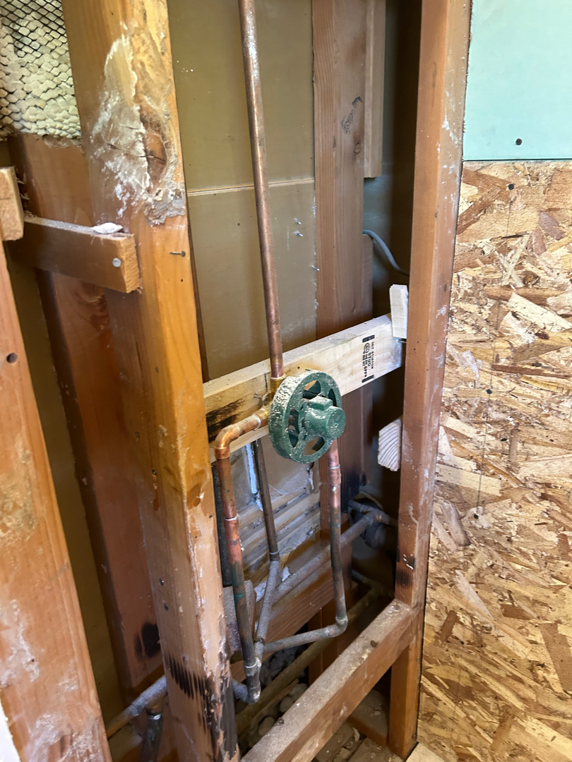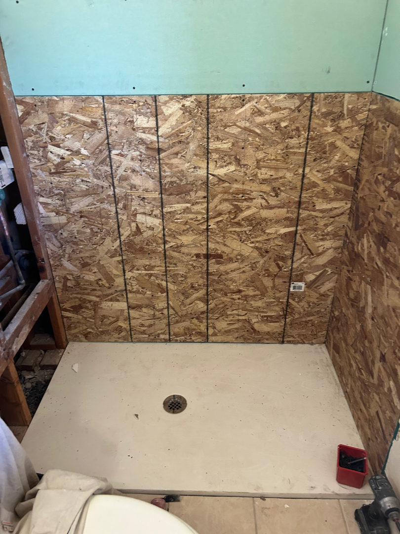 Once the old materials were out, we rolled up our sleeves and reshaped the space from the ground up. We chipped through concrete to relocate the shower drain, installed a new p-trap, then carefully poured and leveled fresh concrete to support the upgrade. From there, a new 32″ x 52″ cultured marble shower pan went in—barrier-free, slip-resistant, and thoughtfully equipped with a collapsible foam threshold to help retain water while making access a breeze.