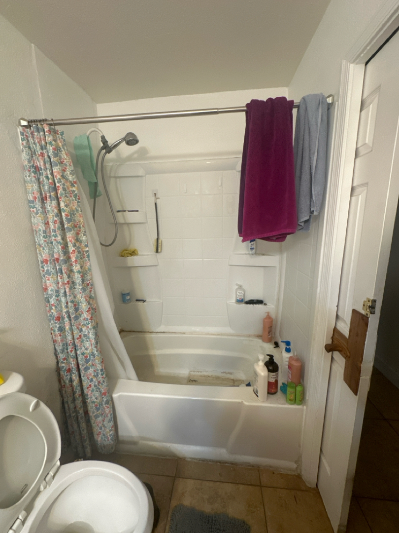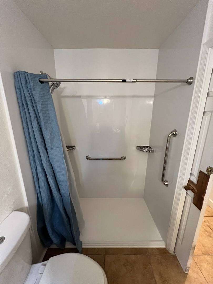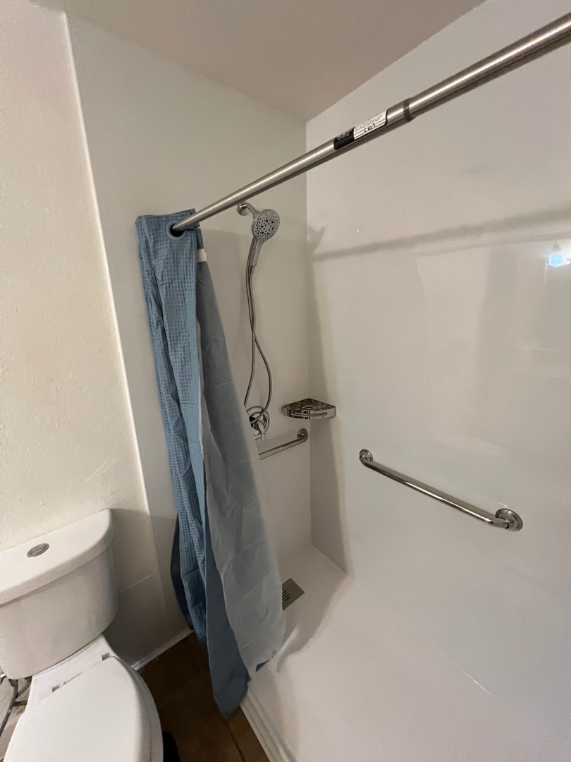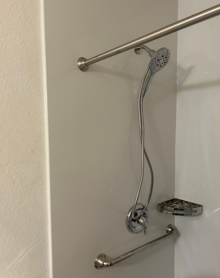 But the project didn’t stop at the basics. For added function and a touch of elegance, the homeowner opted for a modern shower valve setup featuring both a shower head and a handheld wand. Chrome grab bars—three in total—were installed with full ADA-compliant support behind the walls. A sleek metal corner shelf went up exactly where the homeowner wanted it, and the finishing touch: a chrome curtain rod paired with a weighted shower curtain for both style and splash protection.