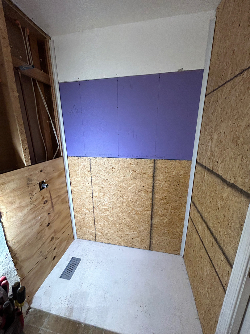 With the space cleared, the real transformation began. Moisture-resistant greenboard was installed to prep the walls, followed by structural backing designed to support grab bars. A slip-resistant, white composite stone shower pan was placed, its barrier-free design making entry easy and safe. The drain was relocated to fit the new configuration, and a collapsible foam threshold with a shower curtain clip was added to help contain water, even without a traditional door.