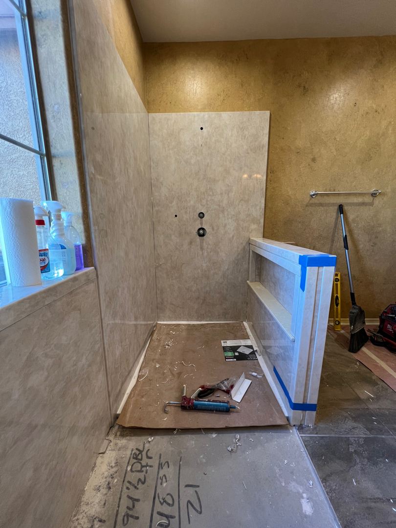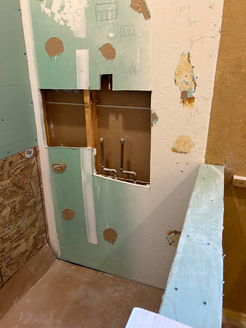 The transformation of this bathroom began with a complete demolition—removing the outdated shower surround, tub valve, and glass to make way for something truly custom. All debris was carefully hauled away, setting the stage for a fresh start.