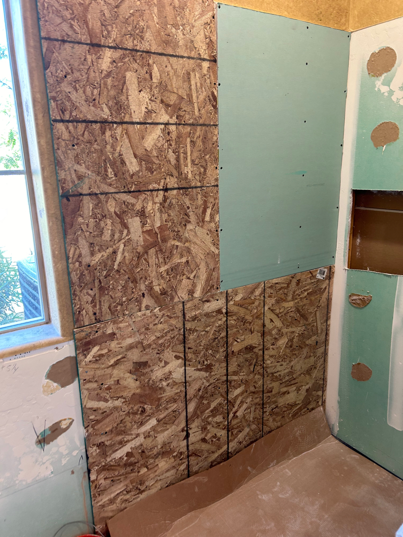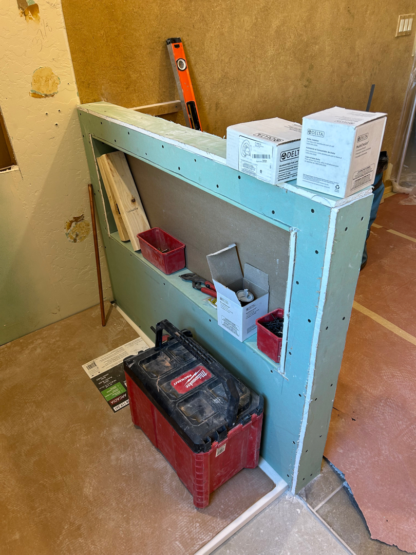 To bring the new design to life, we first built a sleek pony wall approximately 48″ wide and 40″ high, which would later house a long, custom niche tailored to the homeowner’s specifications—perfect for storing shampoos and bath essentials in style. We reinforced the walls with moisture-resistant greenboard and strategically installed backing to support future grab bars, ensuring both durability and accessibility.