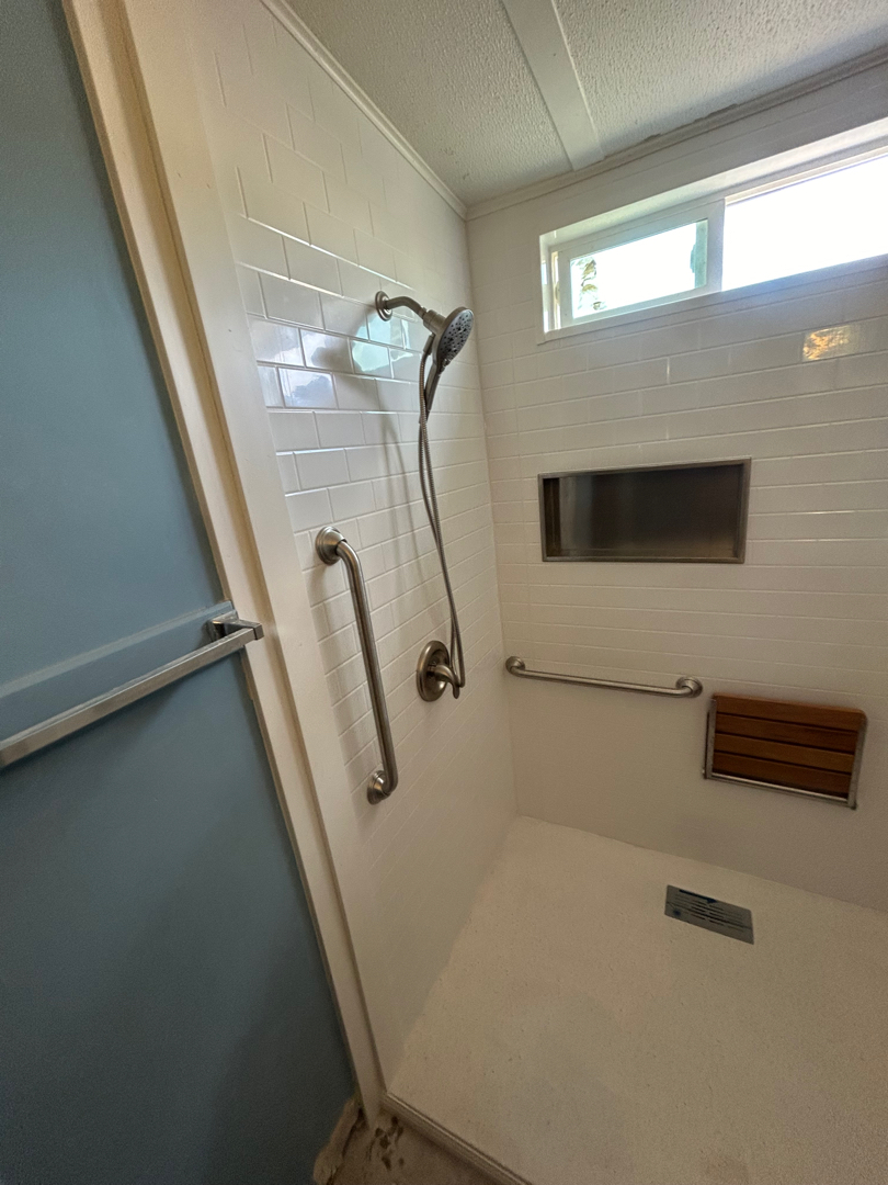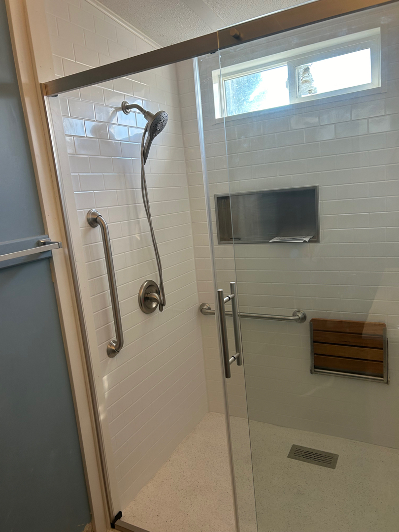 For safety and accessibility, a brushed nickel grab bar was installed, supported by reinforced wall backing. Comfort wasn’t overlooked either—three floating teak shower seats were installed, all with sturdy backing for secure use. These additions blend functionality with spa-like luxury, providing both style and peace of mind.