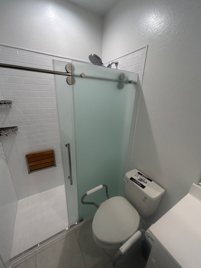 The shower entrance was reimagined with a frosted glass sliding door—one fixed panel and one sliding—for smooth operation and a touch of privacy. To help keep the glass looking spotless, it features an interior spot-resistant coating, though a squeegee is always a handy companion to maintain that fresh-out-of-the-box look.