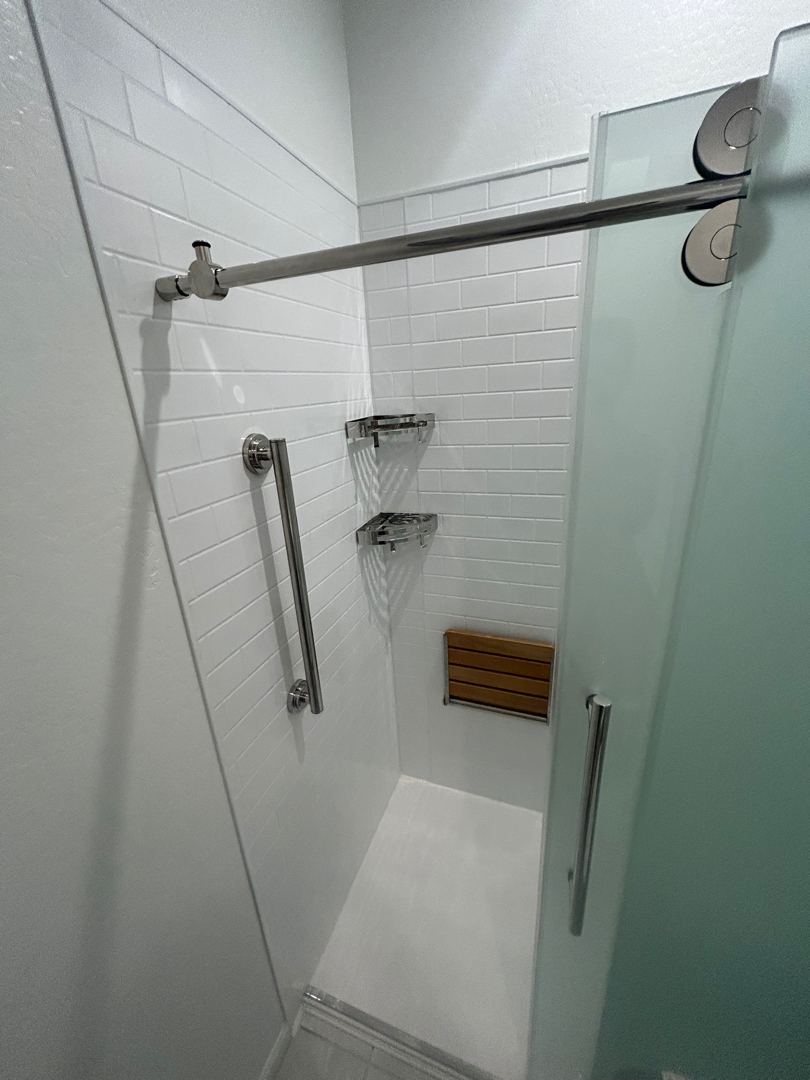 Lastly, a folding teak shower seat was installed, supported by a reinforced 2×6 backing. It’s the perfect blend of style and utility, offering a warm natural tone that contrasts beautifully with the cool chrome accents throughout the space.