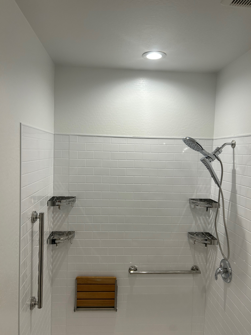 To elevate functionality, we installed a new shower valve paired with a handheld wand in a crisp chrome finish. This flexible setup is perfect for anyone who values ease of use, whether it’s for everyday comfort or a more accessible bathing experience.