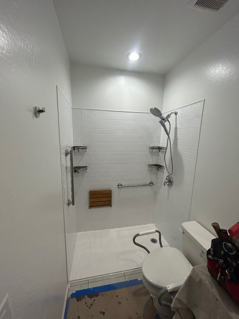 With the space cleared and prepped, we began building the foundation for the new barrier-free shower. The walls were lined with moisture-resistant backing, creating a solid, water-safe surface to support everything that would come next. Reinforced support was added behind the walls—an essential step for the grab bars and folding seat that would provide peace of mind and ease of use.