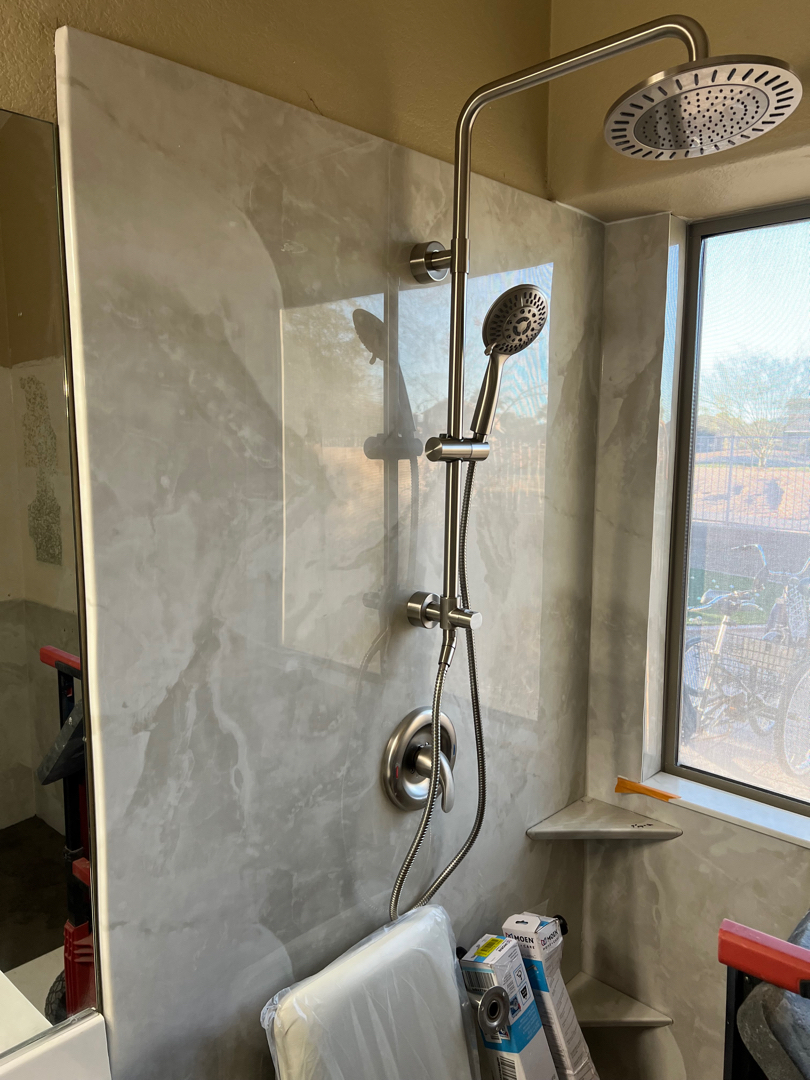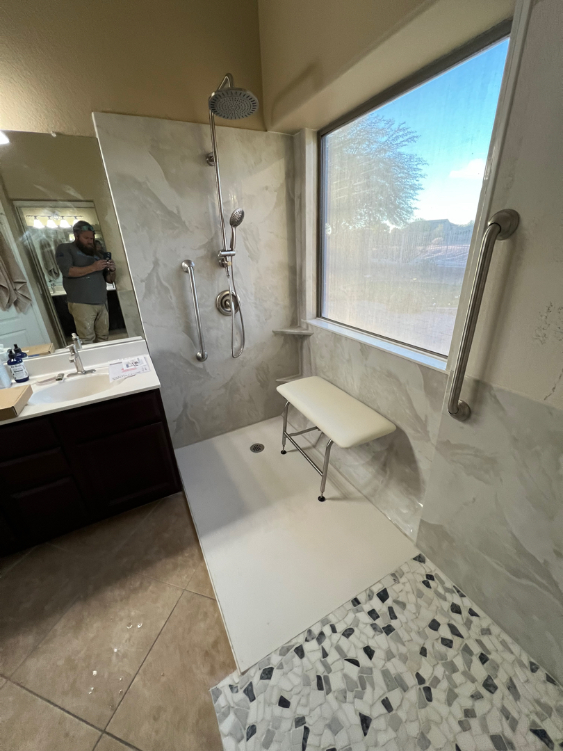 At the heart of this transformation is a sleek, white cultured marble pan, custom-built to a roomy 46 x 60 size. To make the space completely barrier-free, we filled in the right side flooring with the homeowner’s choice of mosaic tile and ramped up seamlessly to the pan. No step, no tripping hazard—just clean, functional design. We then prepped and wrapped the shower walls and window in solid-surface acrylic in an elegant Silver White Marble finish, all sealed and protected for long-lasting beauty.